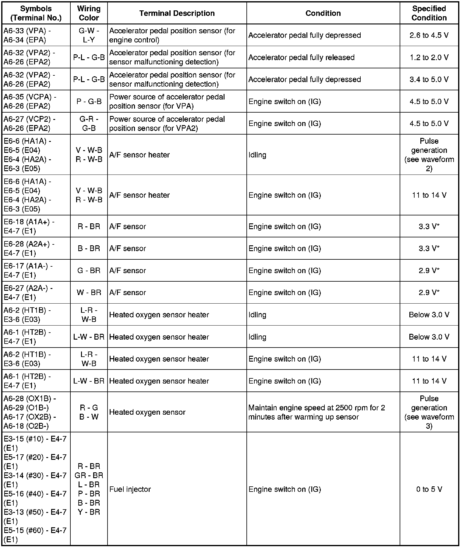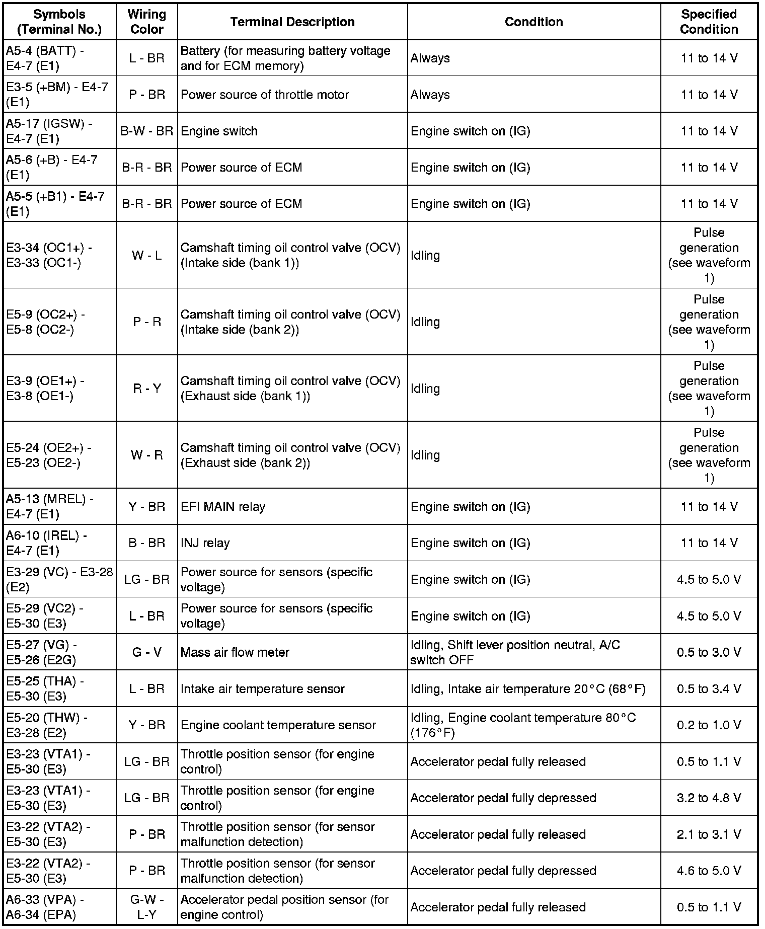 The standard normal voltage between each pair of the ECM terminals is shown in the table below. The appropriate conditions for checking each pair of the terminals are also indicated. The result of checks should be compared with the standard normal voltage for that pair of terminals, displayed in the Specified Condition column. The illustration above can be used as a reference to identify the ECM terminal locations.