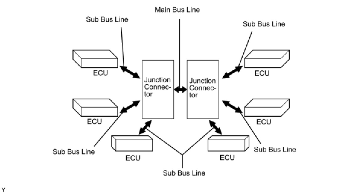 * The CAN uses the multi star style bus connection. The 2 junction connectors are connected with a main bus line. The junction connector extends a sub bus line and enables communication between all the connected ECUs.