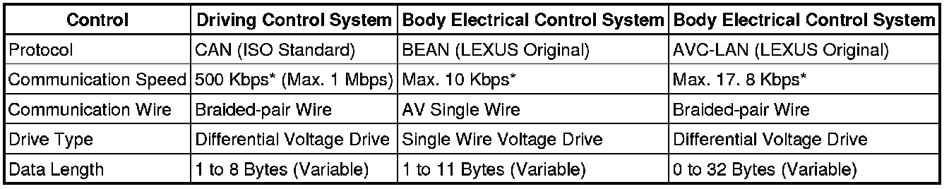 (1) The CAN, BEAN and AVC-LAN protocols have set guidelines for data. The guidelines include communication speed, type of communication wire, drive type and data length. These guidelines are established to facilitate ECU data communication.