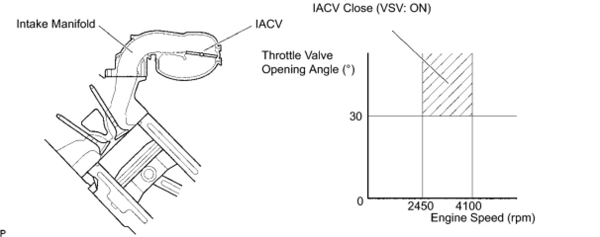 When the Intake Air Control Valve (IACV) opens and closes, the Acoustic Control Induction System (ACIS) control circuit causes the engine load intake efficiency to increase. When the engine is running at 2450 to 4100 rpm and the throttle valve opening angle is 30° or more, current flows through the ACIS control circuit and the IACV closes. For all other situations, current does not flow through the ECM and the IACV is open.