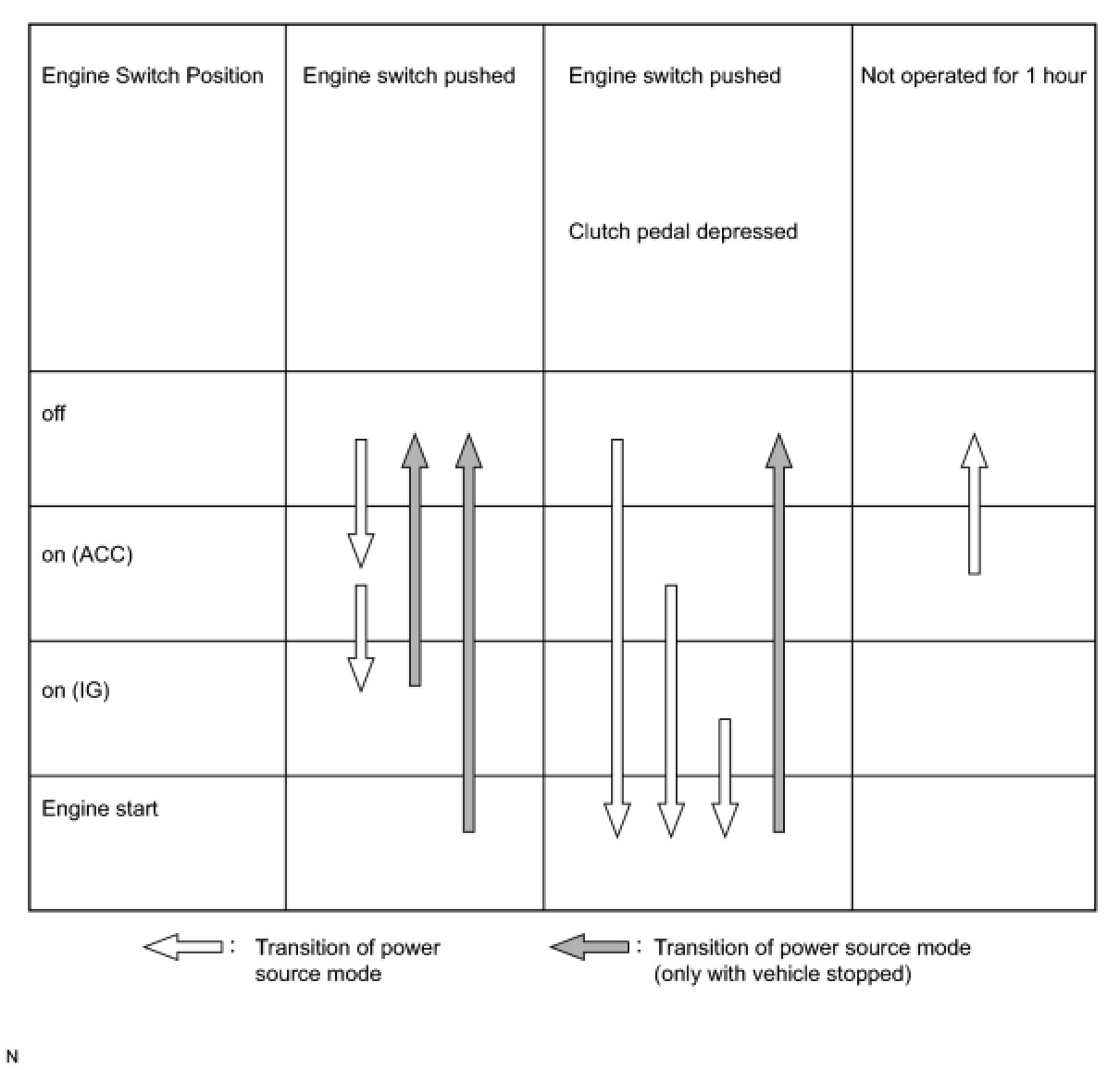 (h) After the buzzer sounds, if the engine switch is pressed within 5 seconds with the brake pedal not depressed (A/T) or clutch pedal not depressed (M/T), the power source mode changes to on (ACC) or on (IG), the same as in the normal condition.