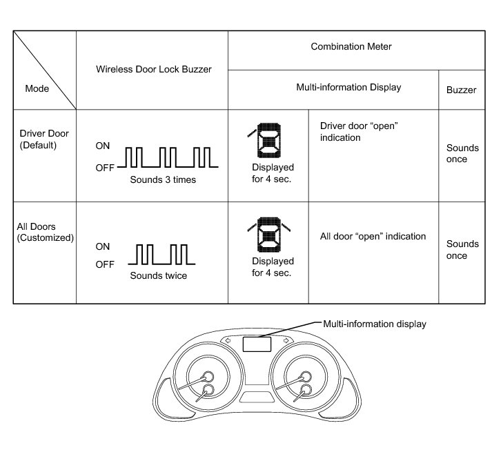 (c) The certification ECU (smart key ECU assembly) sounds the buzzers of the wireless door lock buzzer and combination meter to inform the user that the mode has been changed.
