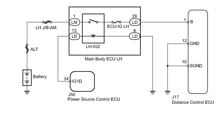This circuit provides power to operate the distance control ECU. The distance control ECU determines information about the vehicle in front based on data from the millimeter wave radar sensor assembly, and then decides how much acceleration or deceleration is needed to maintain the set distance. The distance control ECU also requests the skid control ECU to apply braking and to sound the buzzer.