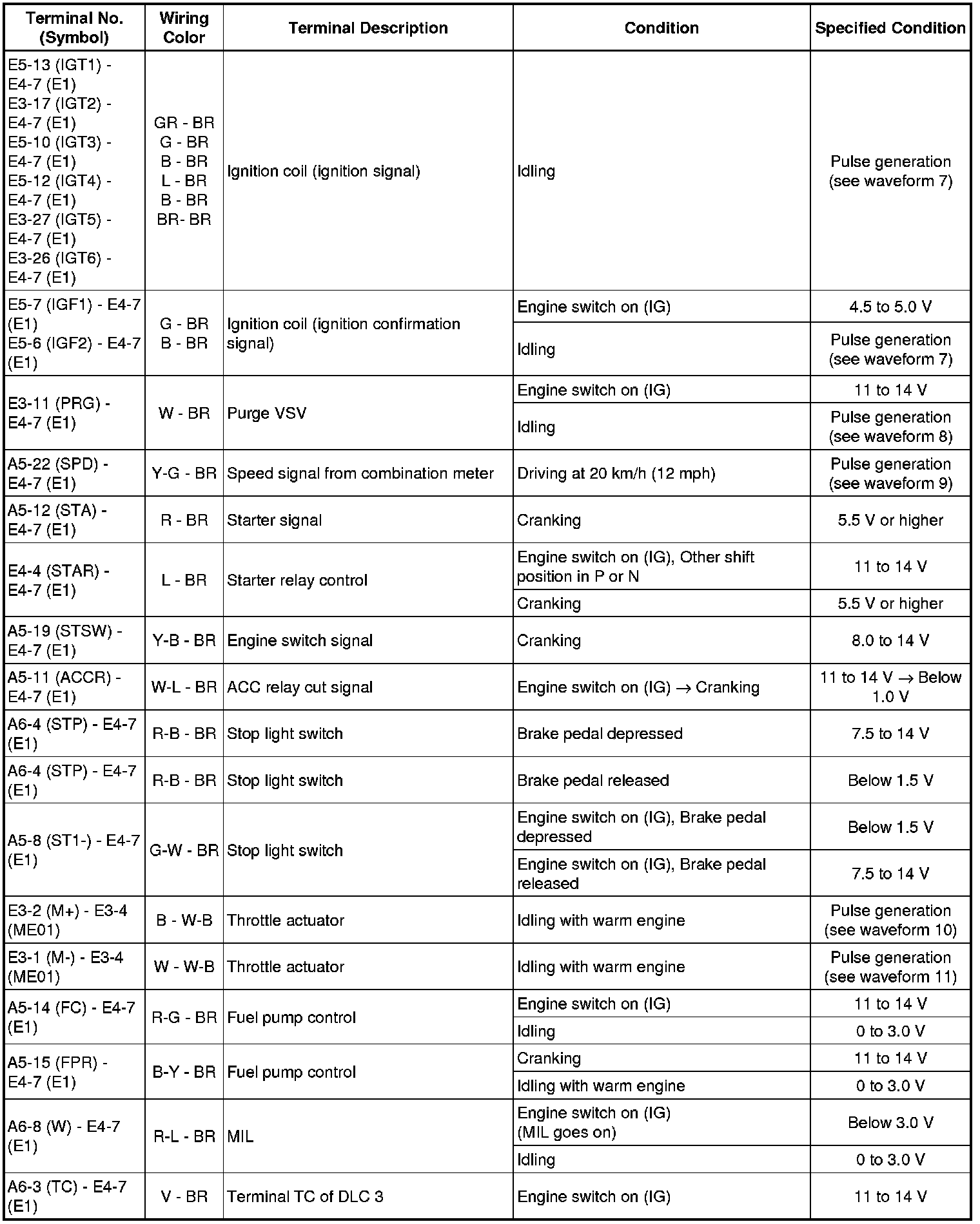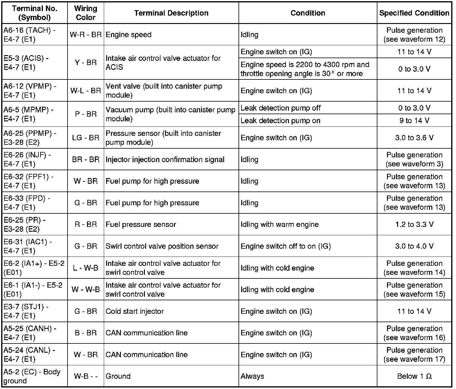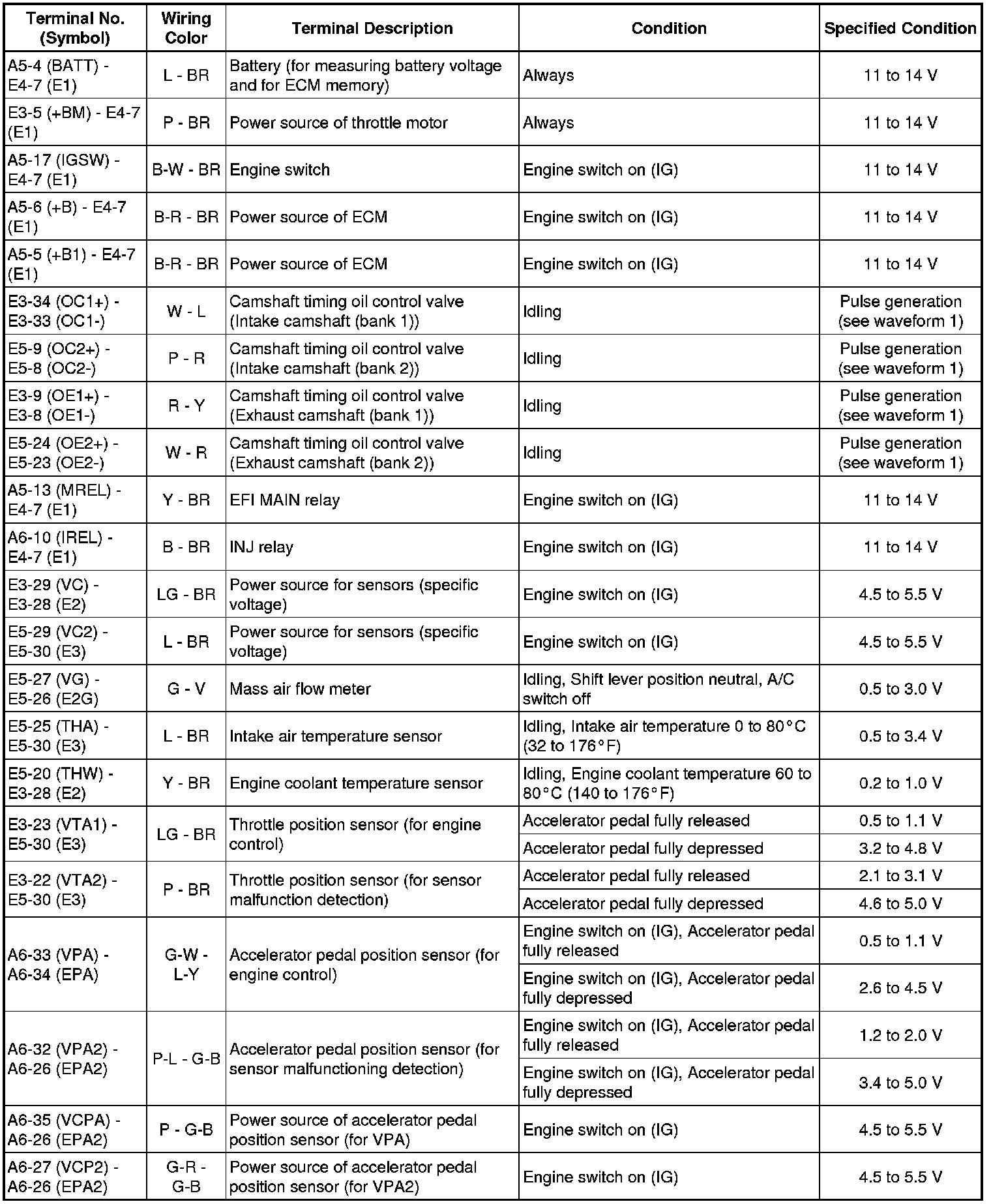 The standard normal voltage between each pair of the ECM terminals is shown in the table below. The appropriate conditions for checking each pair of the terminals are also indicated. The result of checks should be compared with the standard normal voltage for that pair of terminals, displayed in the Specified Condition column. The illustration above can be used as a reference to identify the ECM terminal locations.