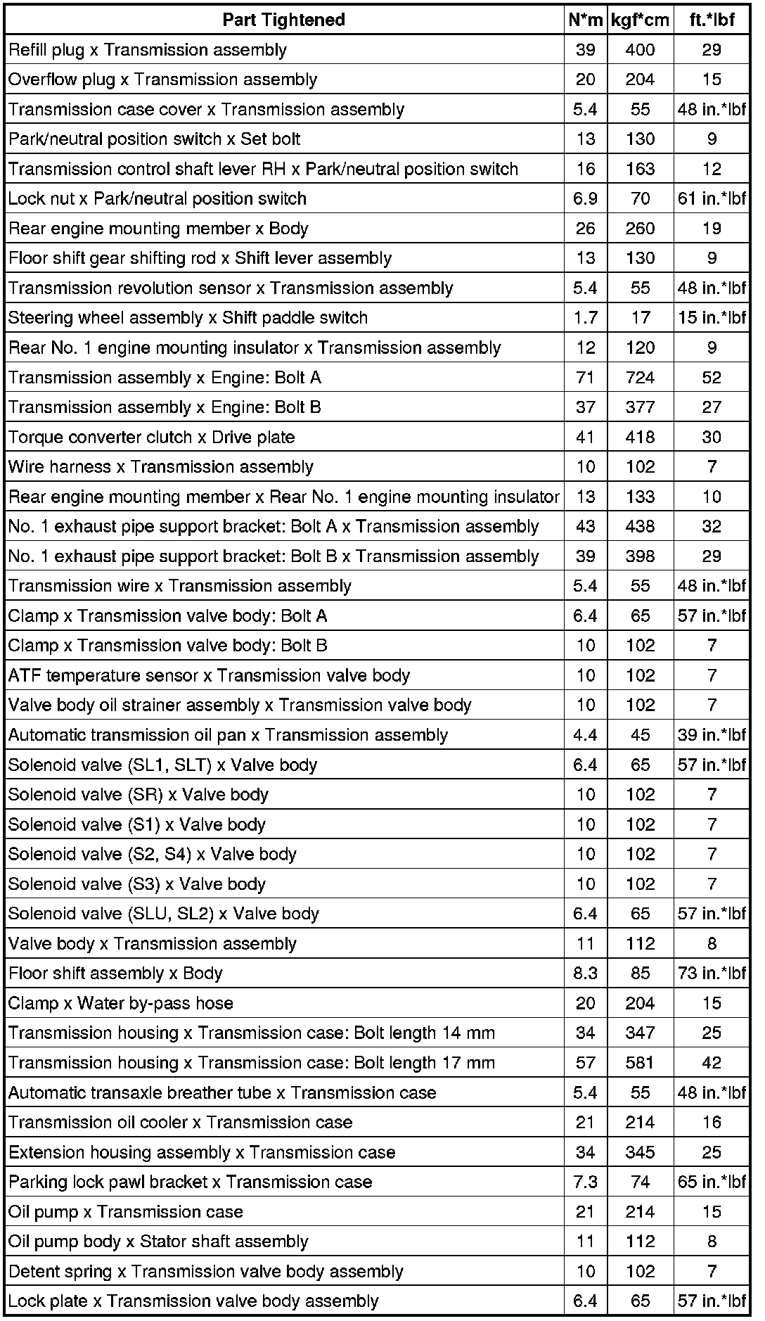 SPECIFICATIONS: A960E AUTOMATIC TRANSMISSION / TRANSAXLE: TORQUE SPECIFICATIONS
