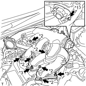 Install the intake air surge tank assembly with the 6 bolts (B)