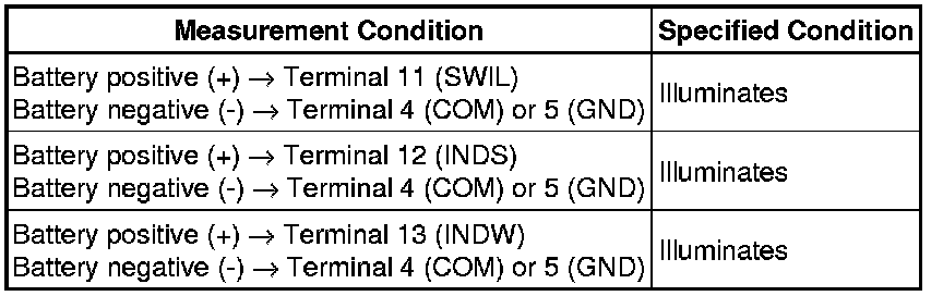 (b) Apply battery voltage between the terminals of the switch, and check the illumination condition of the switch.