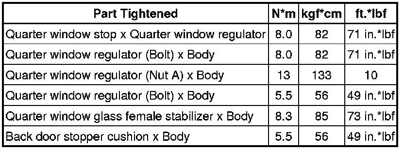 SPECIFICATIONS: WINDOW / GLASS: TORQUE SPECIFICATIONS