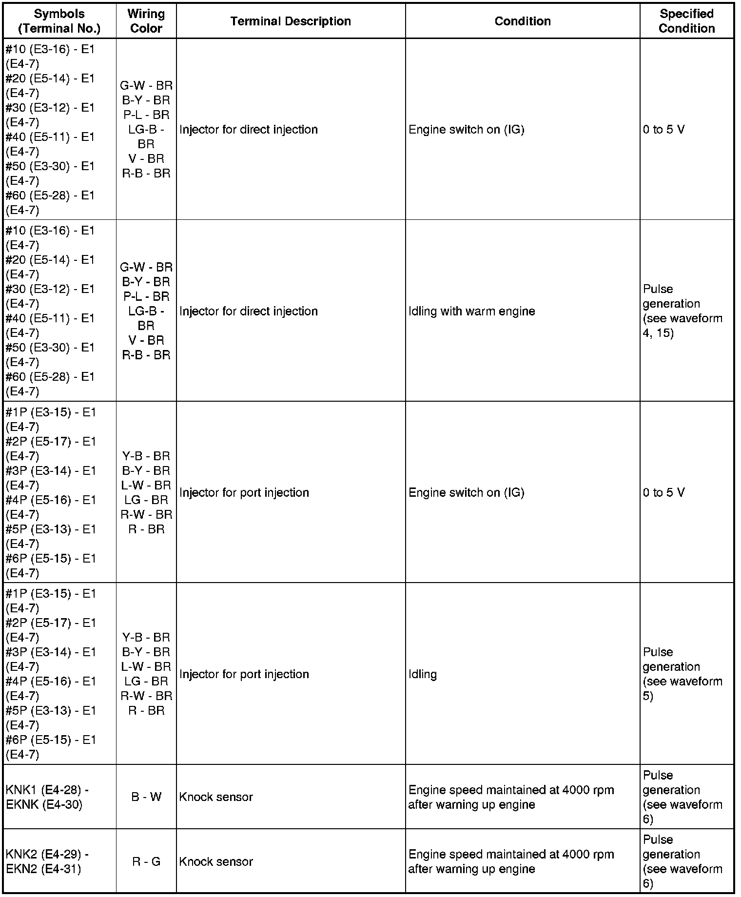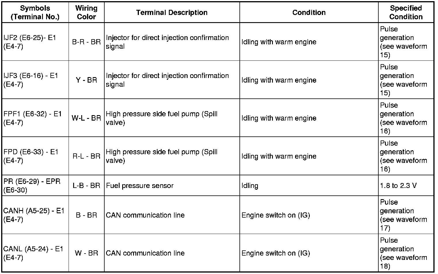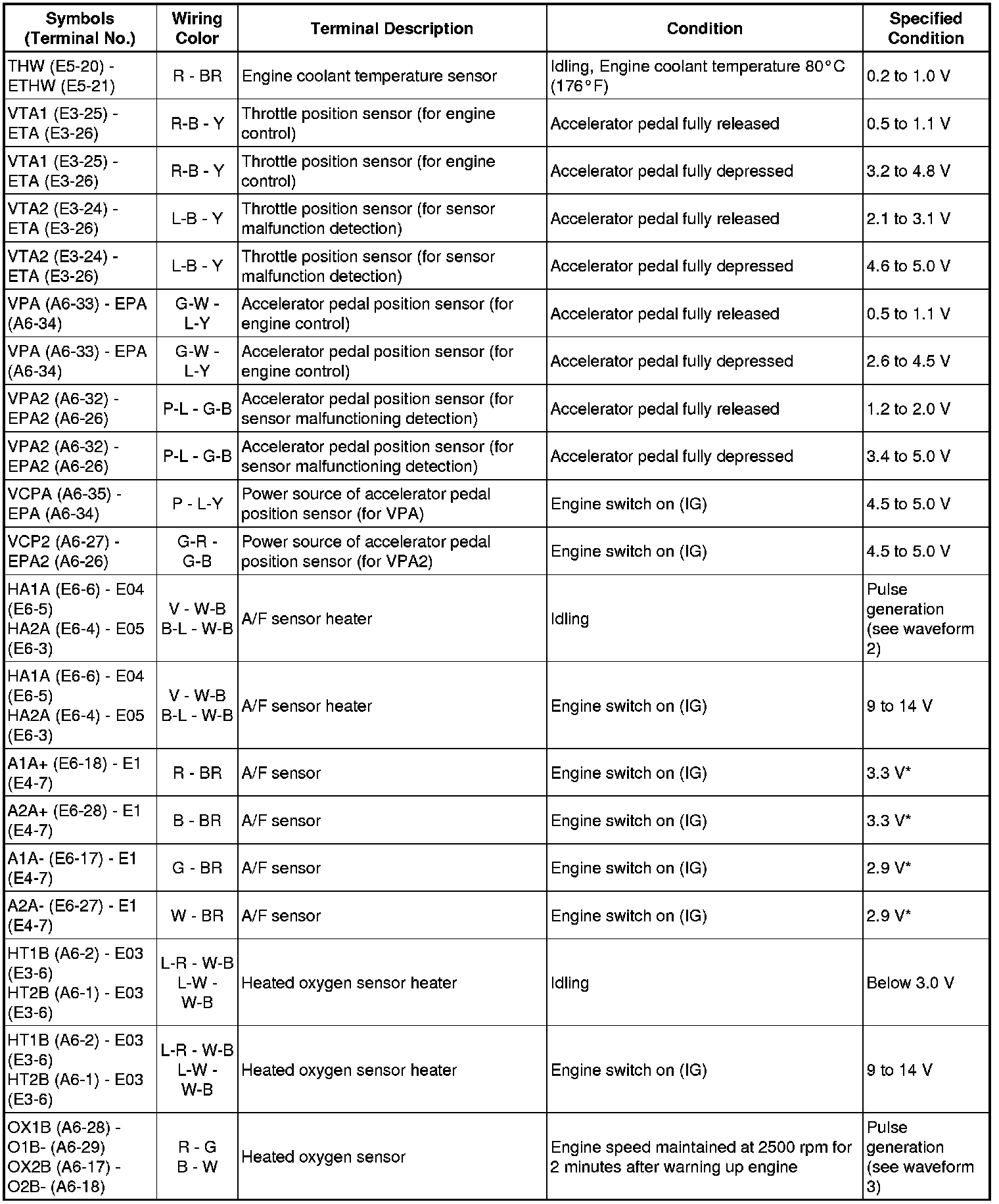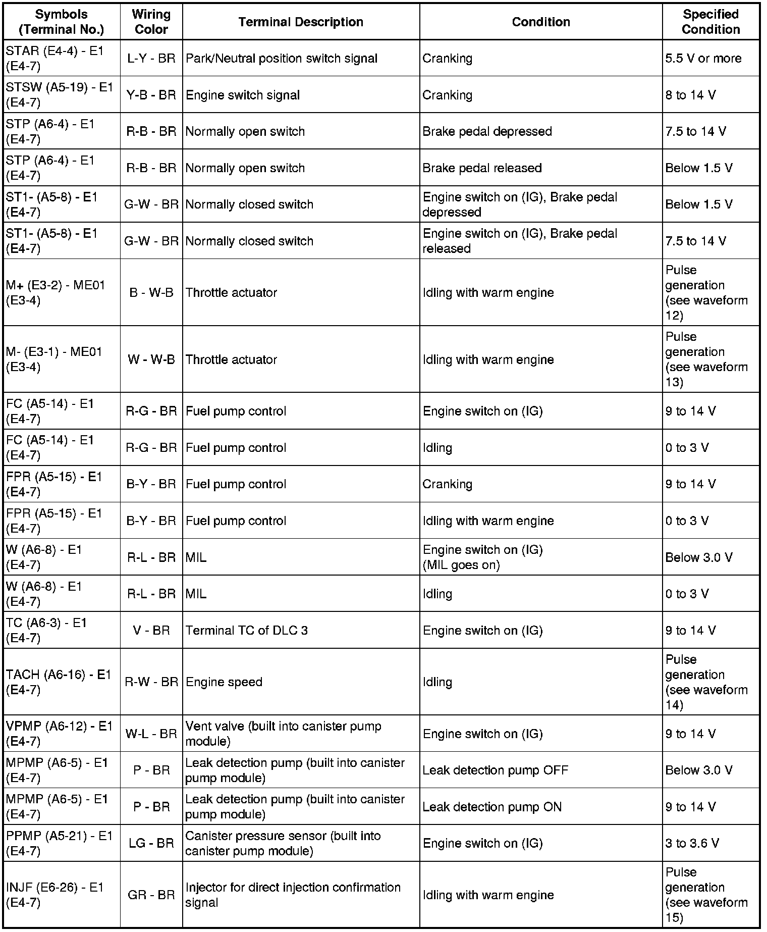 The standard normal voltage between each pair of the ECM terminals is shown in the table below. The appropriate conditions for checking each pair of the terminals are also indicated. The result of checks should be compared with the standard normal voltage for that pair of terminals, displayed in the Specified Condition column. The illustration above can be used as a reference to identify the ECM terminal locations.
