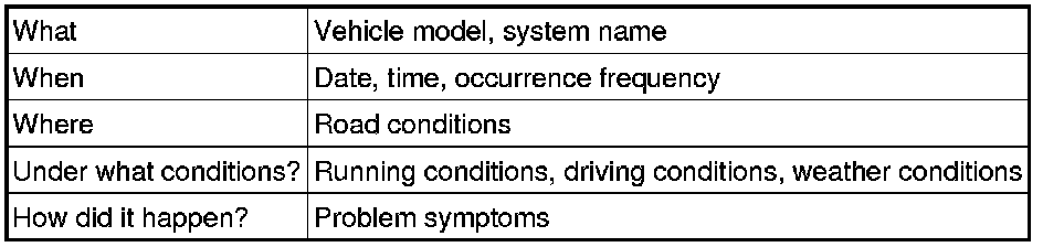 The most difficult case in troubleshooting is when no problem symptoms occur. In such a case, a thorough problem analysis must be carried out. A simulation of the same or similar conditions and environment in which the problem occurred in the customer's vehicle should be carried out. No matter how much skill or experience a technician has, troubleshooting without confirming the problem symptoms will lead to important repairs being overlooked and mistakes or delays.
