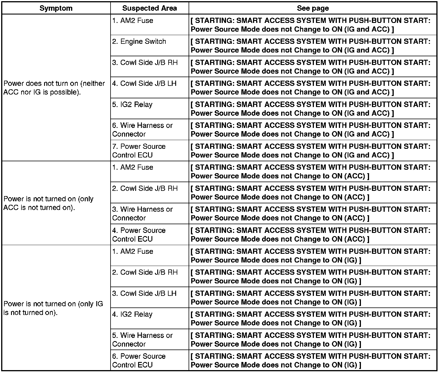 2GR-FSE STARTING: SMART ACCESS SYSTEM WITH PUSH-BUTTON START: PROBLEM SYMPTOMS TABLE