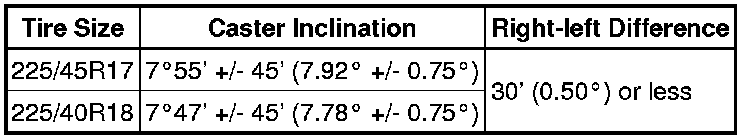 If the camber and steering axis inclination are not within the specified range after the caster has been correctly adjusted, recheck the suspension parts for damaged and/or worn out parts.