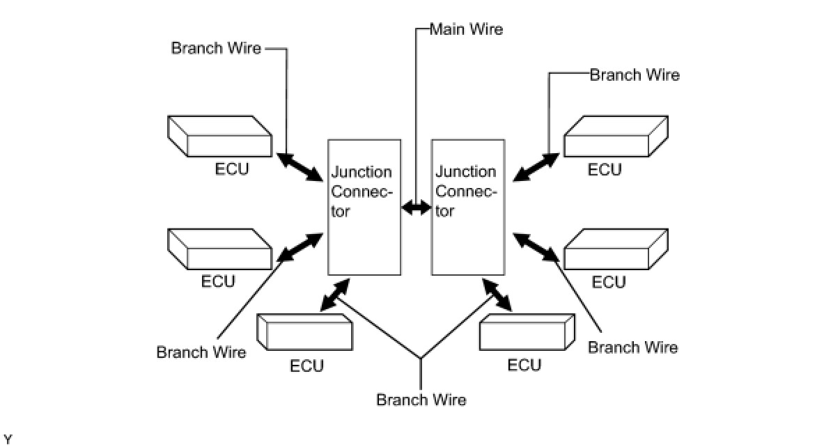 * The CAN uses the multi star style bus connection. The 2 junction connectors are connected with a main bus line. The junction connector extends a sub bus line and enables communication between all the connected ECUs.