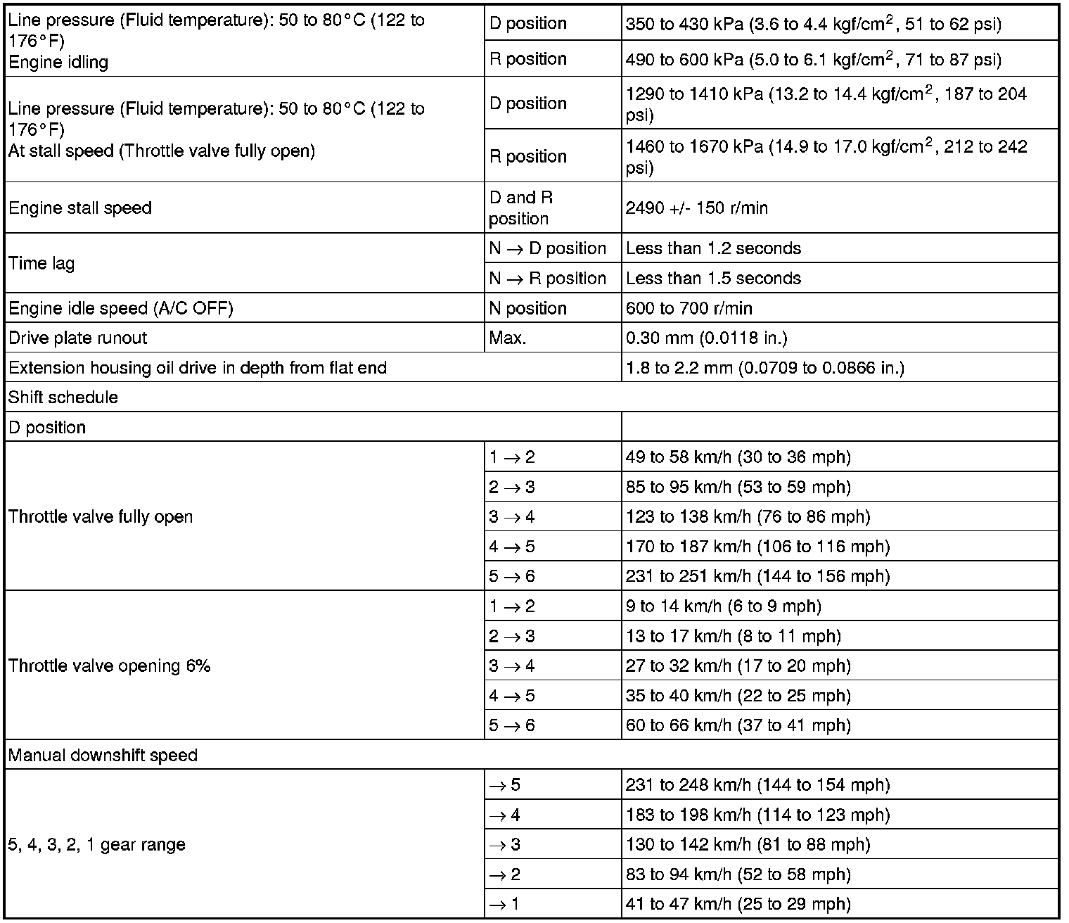 * All shift point values indicated in the above tables are actual values. Therefore, if checking a shift point with a chassis dynamometer, keep in mind that there is a range of error in the chassis dynamometer indication.