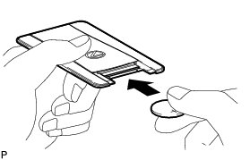 (a) Push in and install the transmitter battery (lithium battery) while being careful of the following: 1) the orientation of the battery positive (+) and negative (- ) terminals; and 2) being sure to insert the battery between the 2 terminals and deep into the card, in the direction shown by the arrow in the illustration.