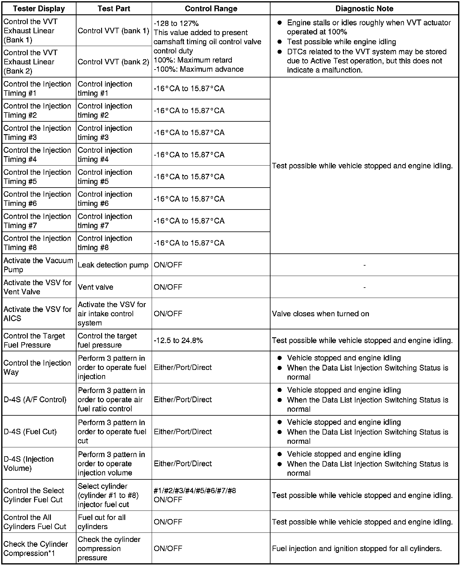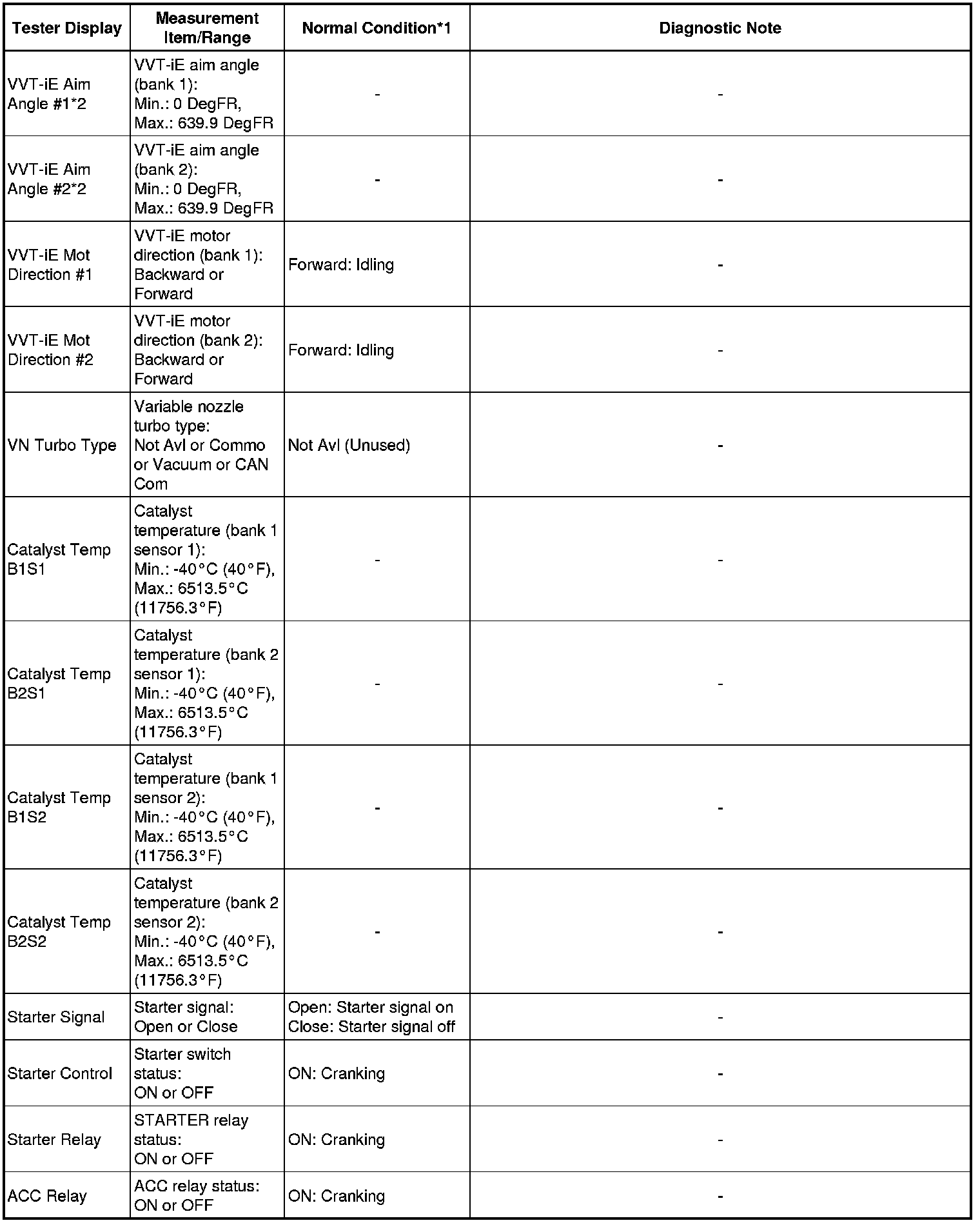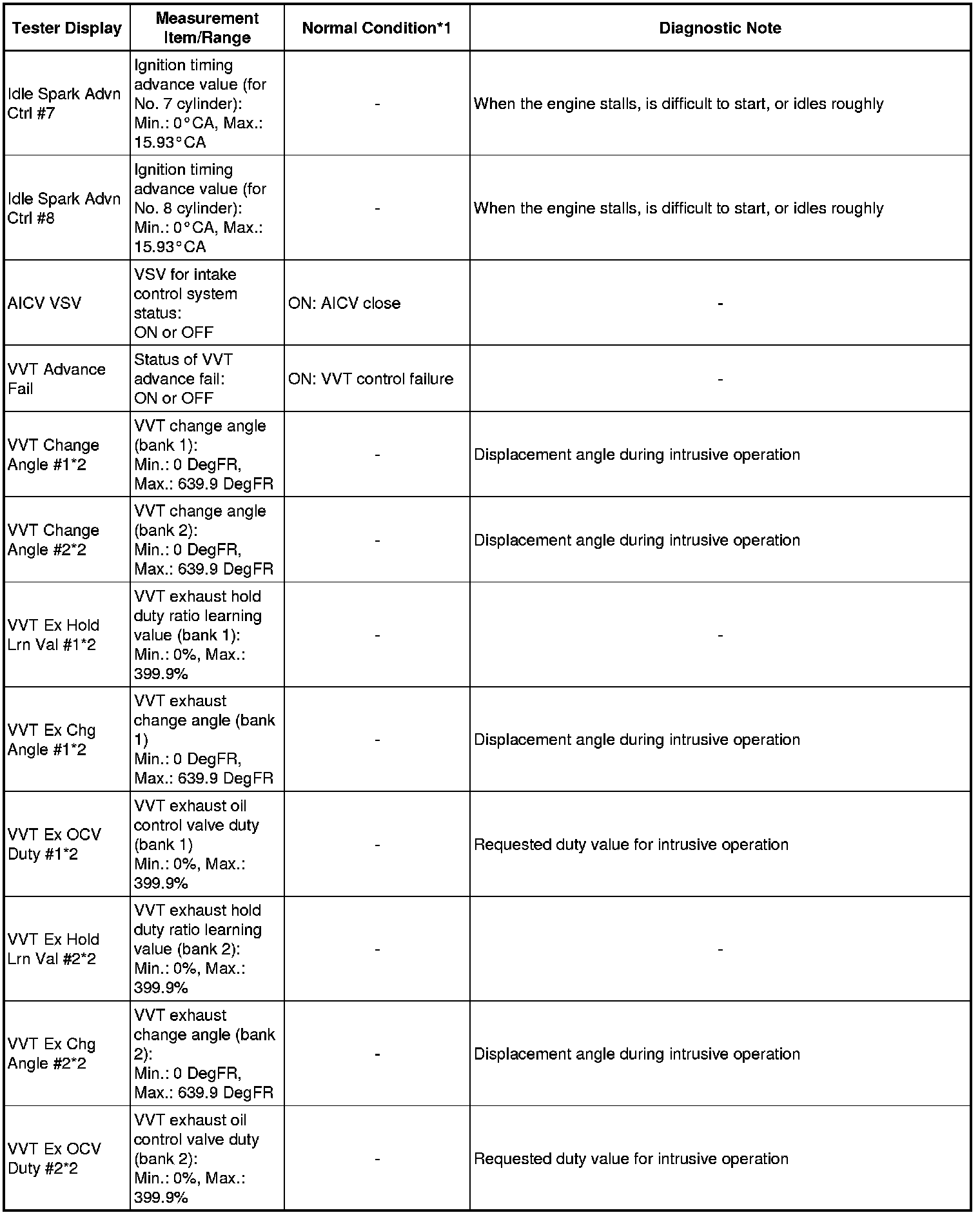 * *2: These Data List values are only displayed when performing the following Active Tests: Control the VVT-iE Linear (Bank 1), Control the VVT-iE Linear (Bank 2), Control the VVT Exhaust Linear (Bank 1) and Control the VVT Exhaust Linear (Bank 2). For other Active Tests, the Data List value will be 0.