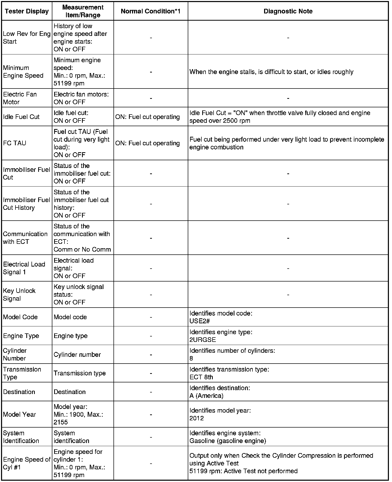 At first, the Techstream displays extremely high cylinder engine speed values. After approximately 10 seconds of engine cranking, each cylinder engine speed measurement will change to the actual engine speed.
