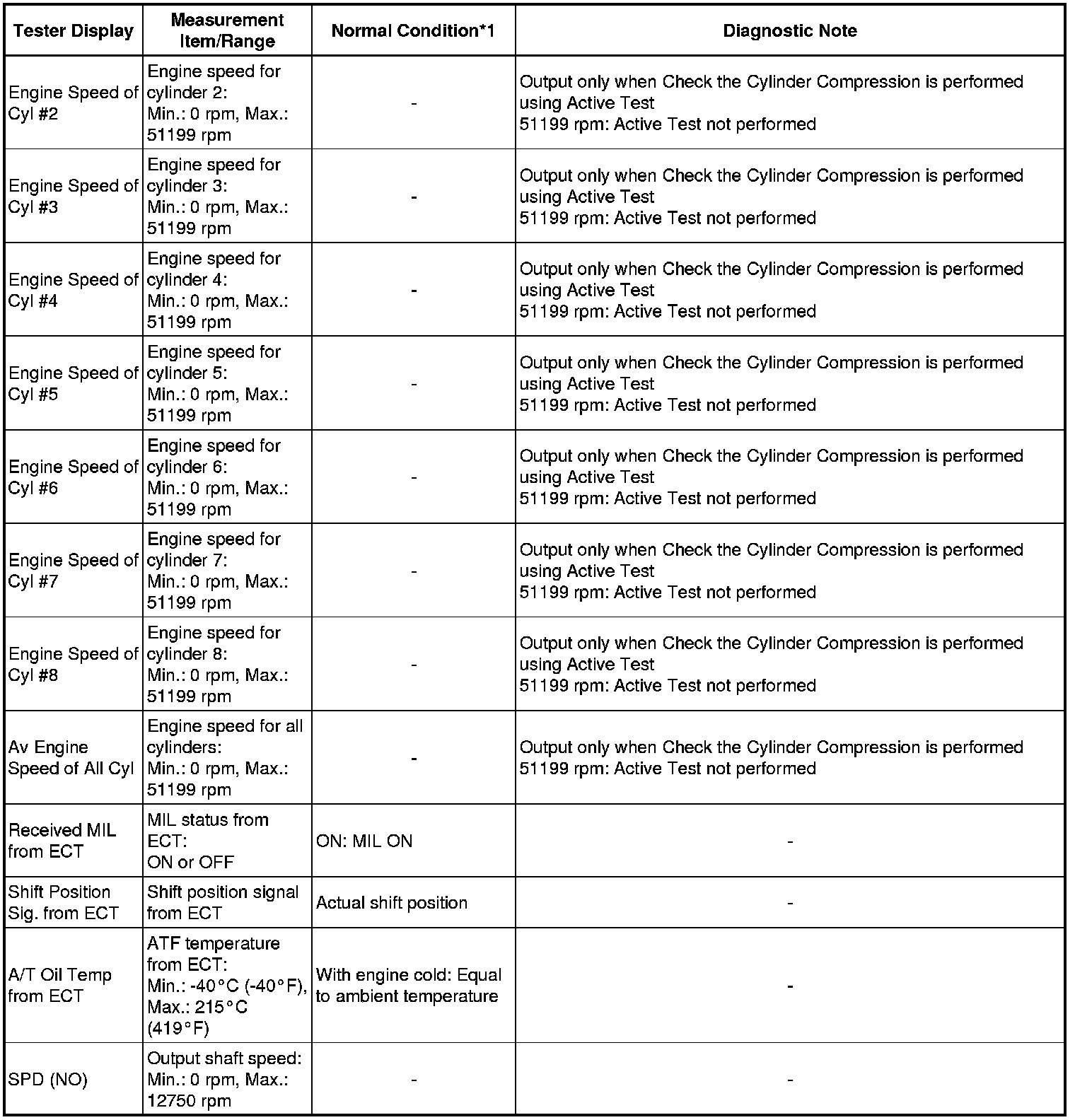 *1: In this Active Test, the fuel and ignition of all cylinders is cut. The engine must then be cranked for approximately 10 seconds. At this time, the speed of each cylinder is measured. If the speed of one cylinder is more than the other cylinders, it can be determined that the compression pressure of that cylinder is lower than the other cylinders.