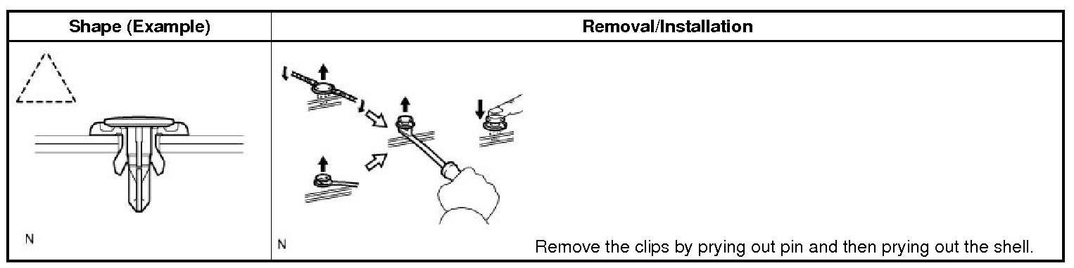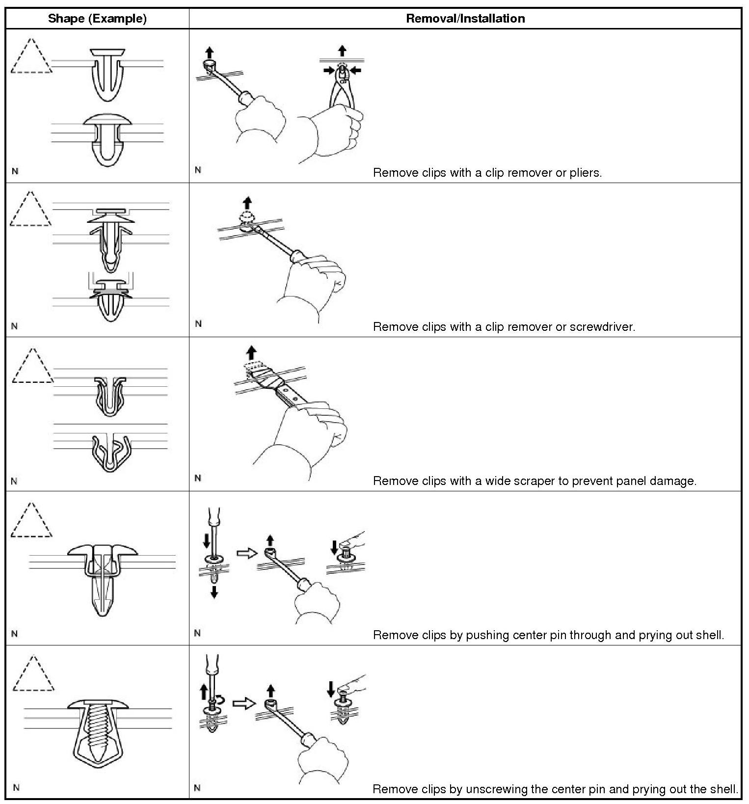 (1) The removal and installation methods of typical clips used for vehicle body parts are shown in the table below.