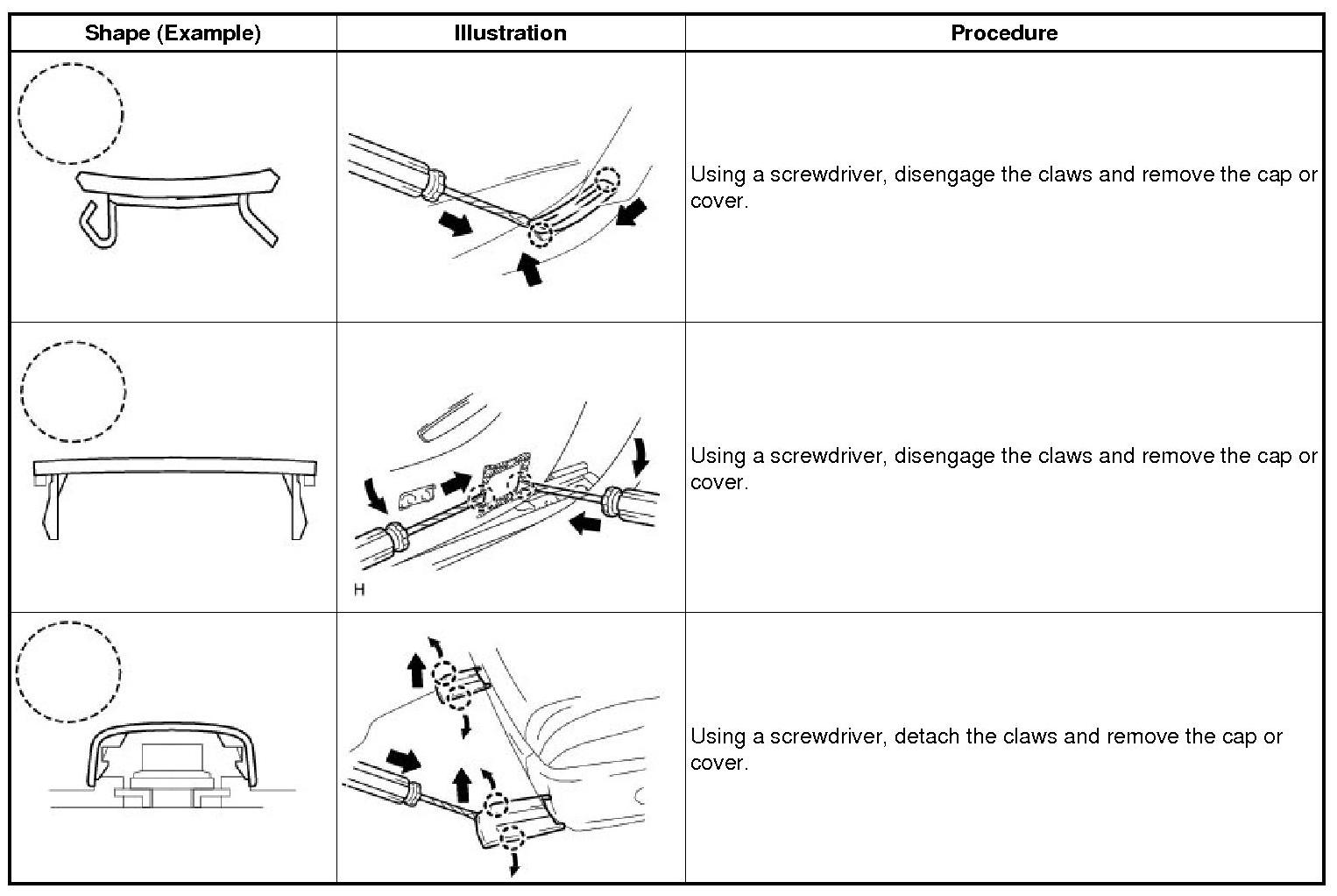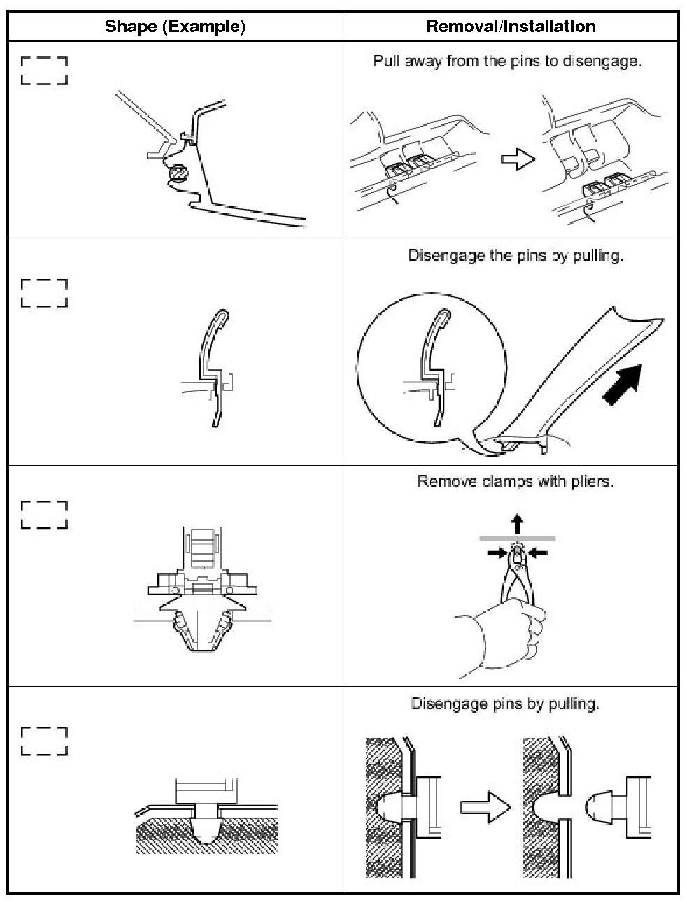 (1) The removal and installation methods of typical claws used for vehicle body parts are shown in the table below.