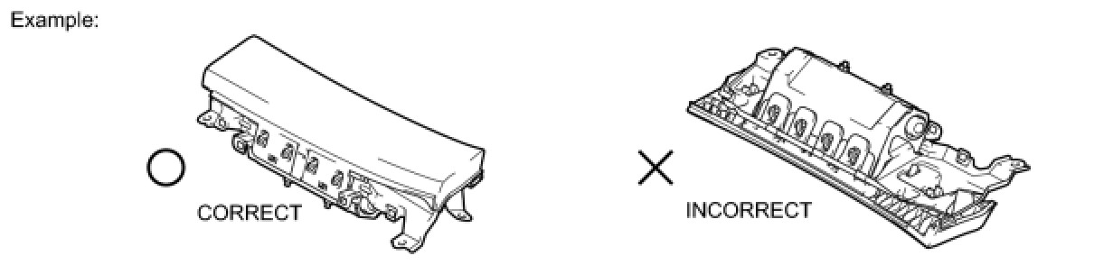 (1) Always place a removed or new driver side knee airbag assembly with the airbag deployment direction facing upward. Placing the airbag assembly with the airbag deployment direction facing downward could cause a serious accident if the airbag deploys.