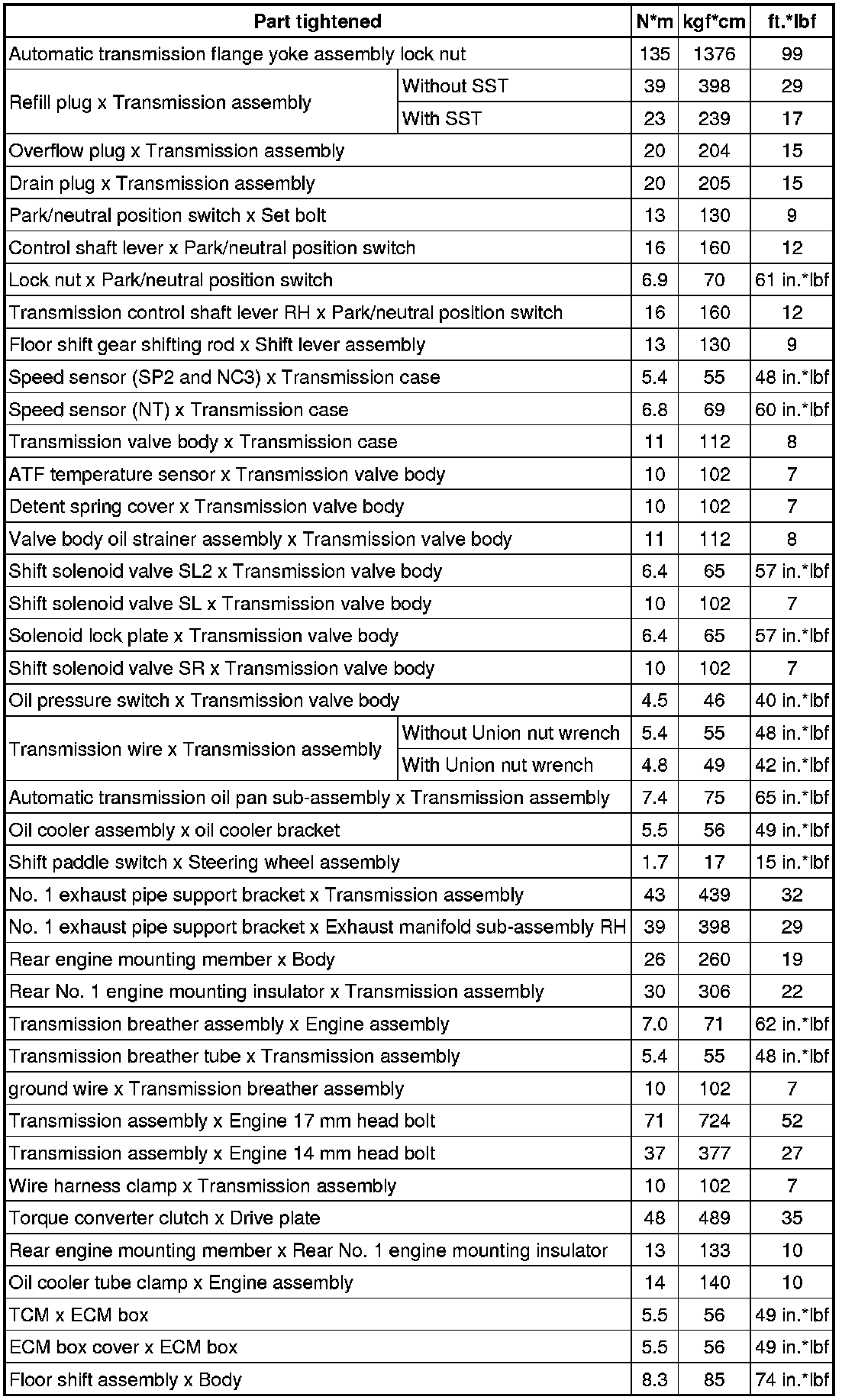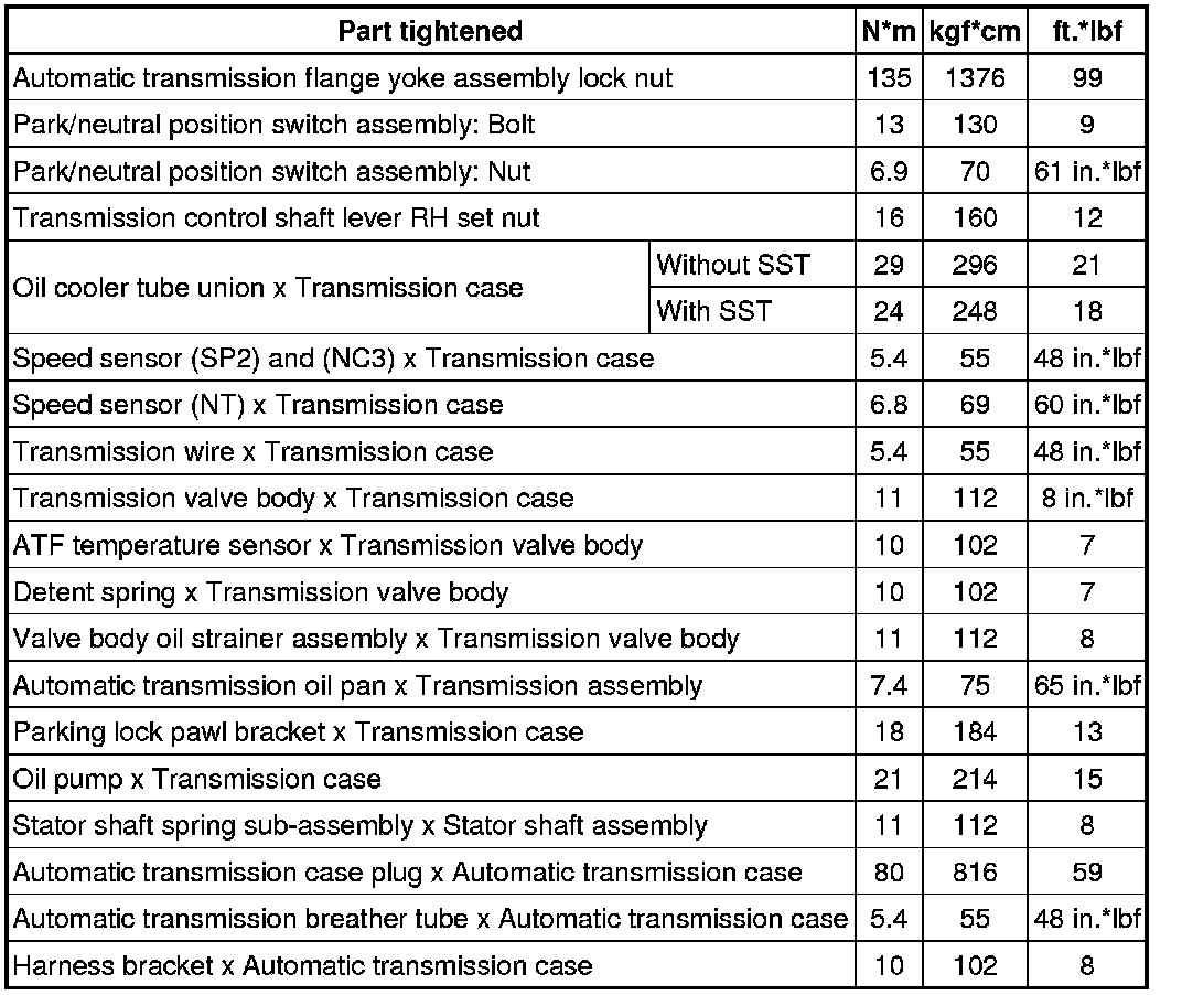 SPECIFICATIONS: AA80E AUTOMATIC TRANSMISSION / TRANSAXLE: TORQUE SPECIFICATIONS