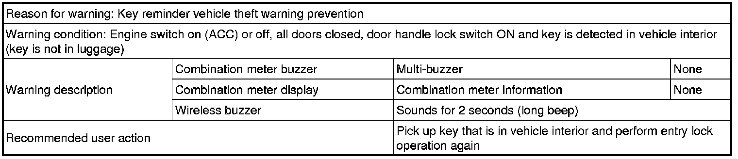 (d) If the key is located inside of the cabin, the door lock function will not operate and the alarm buzzer (beep sound) will sound for 2 seconds.