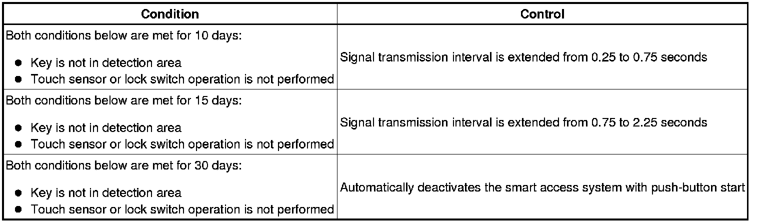 In the smart access system with push-button start, signals are emitted outside of the vehicle at a prescribed interval (0.25 seconds) when the doors are locked. Therefore, the vehicle battery could be drained if the vehicle remains parked for a long time. For this reason, the controls listed below exist.