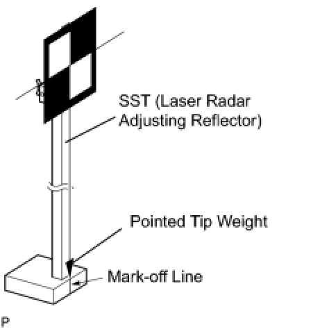 (2) Hang a weight with a pointed tip from the center of the target sheet. Then with double-sided tape, attach the target sheet to the reflector so that the weight aligns with the mark-off line of the SST (laser radar adjusting reflector).