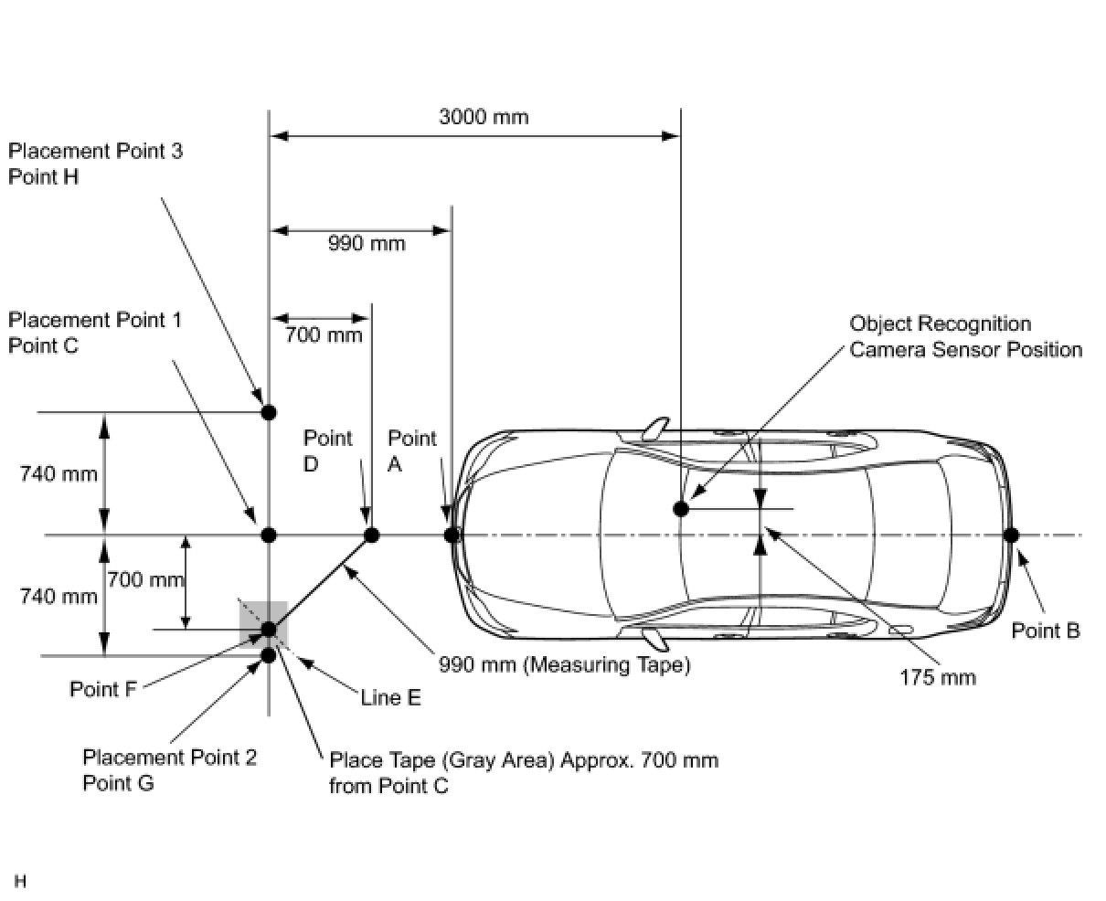 Set measuring tape from point F to C. Then mark point H 740 mm (29.1 in.) beyond point C (placement point 3).