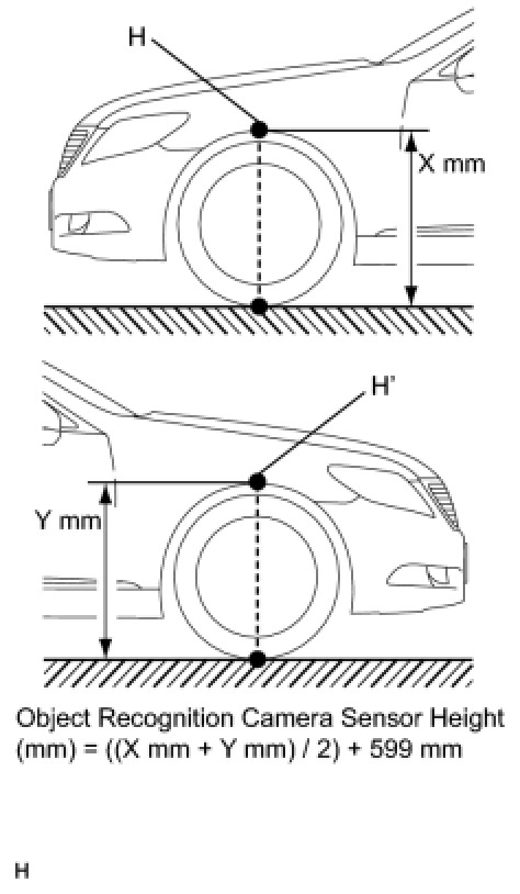 (1) Measure the distance (X mm or in.) from the ground to point H for the front left wheel arch.