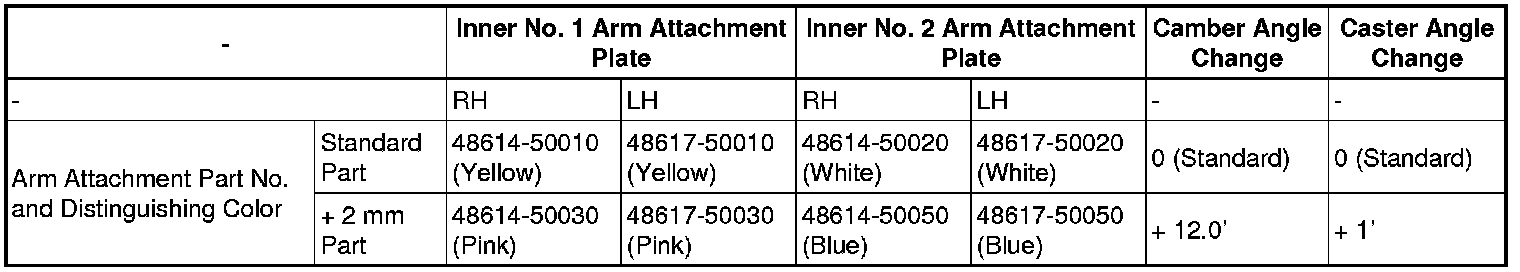 (a) If the right and left camber values are not within the specified value even though the camber and caster have been adjusted with the toe adjusting cam and camber adjusting cam, replace the inner No. 1 and No. 2 arm attachment plates and perform the camber adjustment.