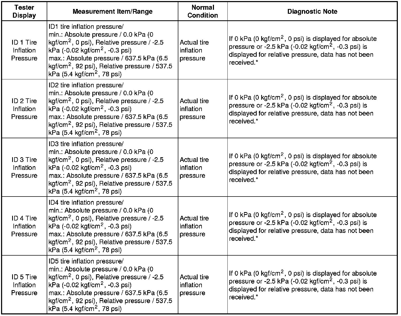 * The initialization is complete when the Data List "ID Tire Inflation Pressure" display shows the correct pressures.
