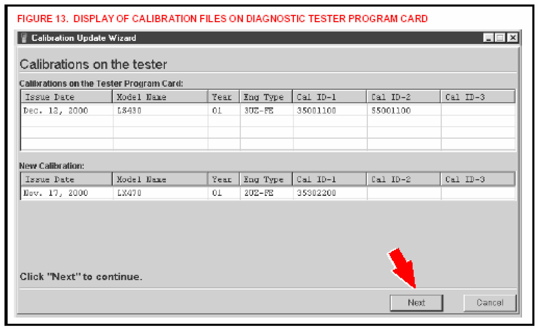 J. The top half of the CUW screen displays the calibrations currently stored on the Diagnostic Tester Program Card. The bottom half of the screen displays the new calibration to be loaded onto the Diagnostic Tester Program Card (see Figure 13). Click NEXT to continue the process.