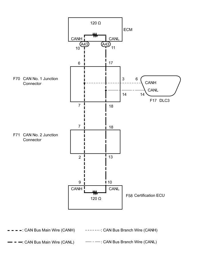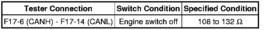 There may be an open circuit in the CAN bus main wire and/or the DLC3 branch wire when the resistance between terminals 6 (CANH) and 14 (CANL) of the DLC3 is 70 Ohms or higher.