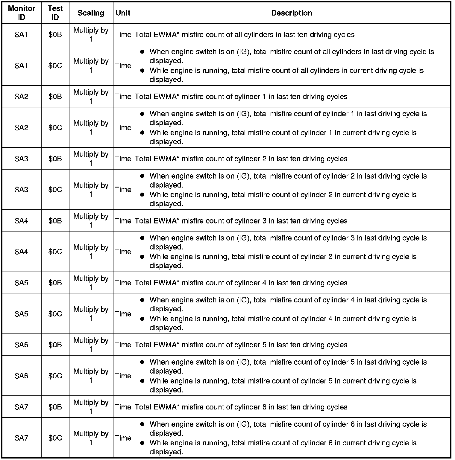 *: EWMA (Exponential Weighted Moving Average) misfire counts for last 10 driving cycles (calculated) Calculation: 0.1 x (current counts) + 0.9 x (previous average) Initial value for (previous average) = 0