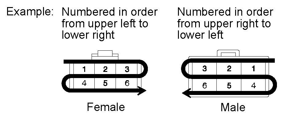 On Right : Male connector shapes Numbers indicate pin numbers.