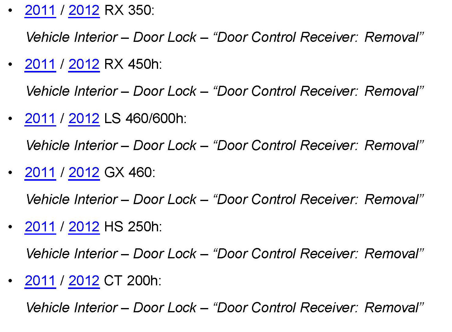 1. Install updated Door Control Receiver. Refer to the Technical Information System (TIS) applicable model and model year Repair Manual: