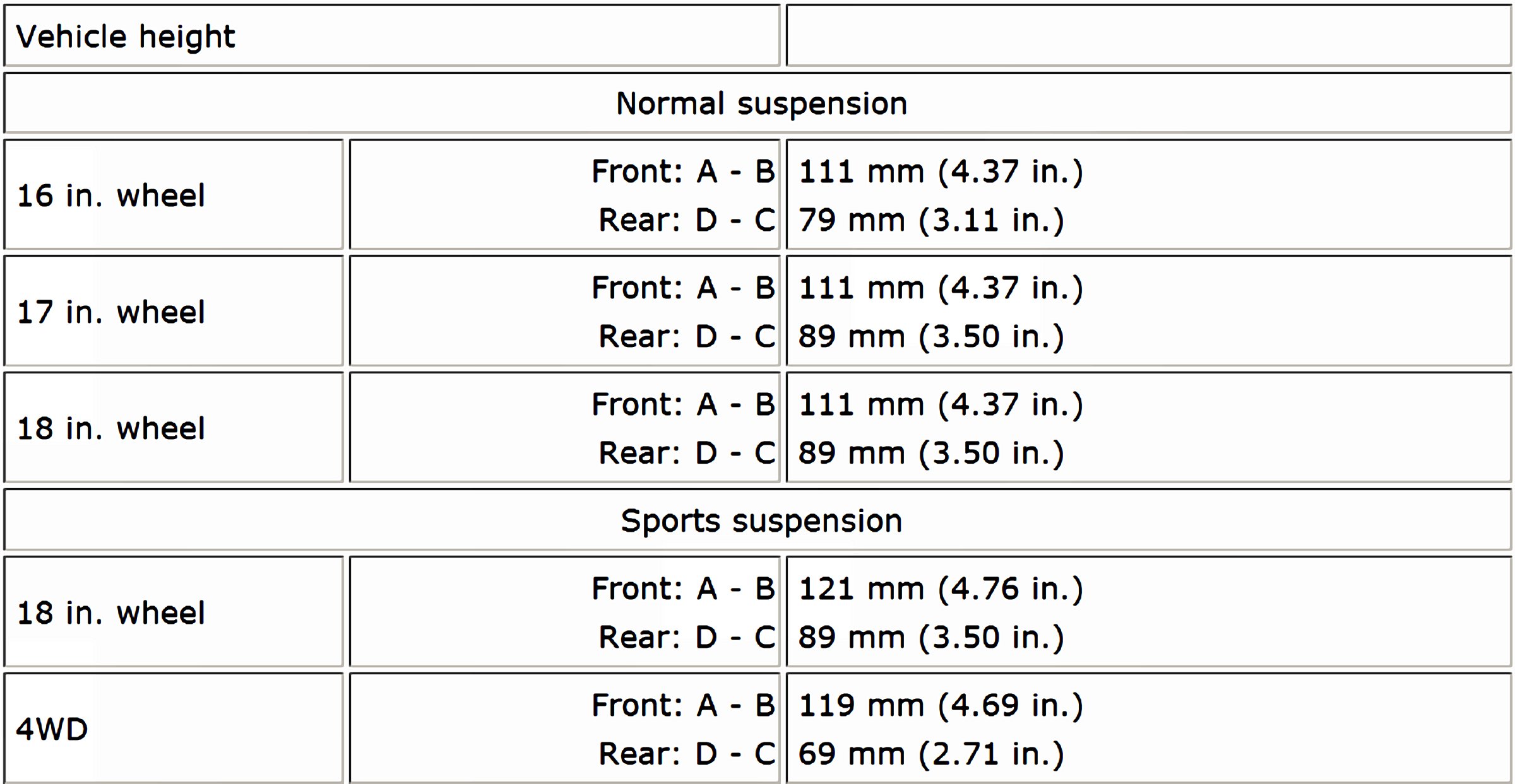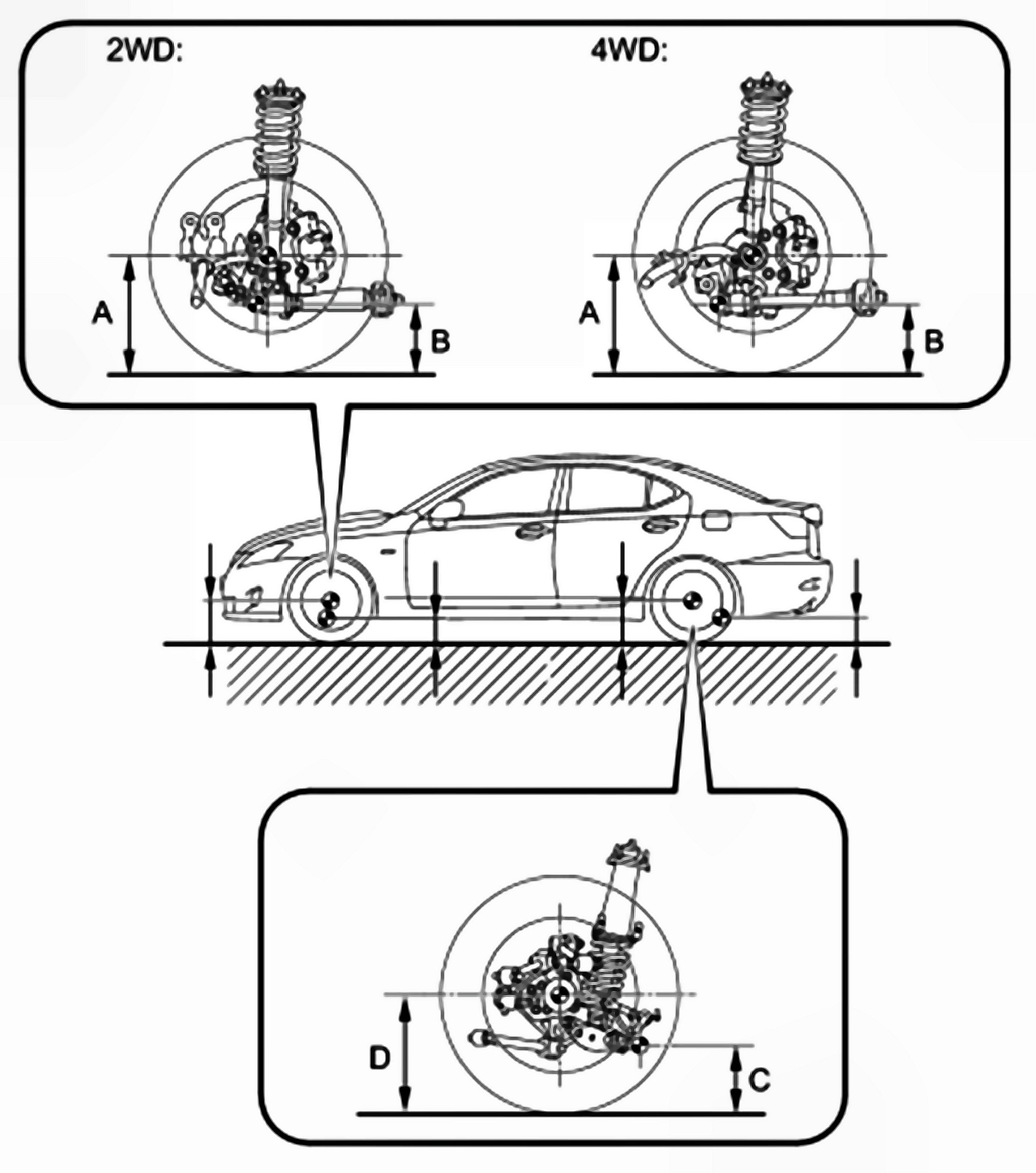 B: Ground clearance of front center position of front suspension lower arm front bush installation bolt head.