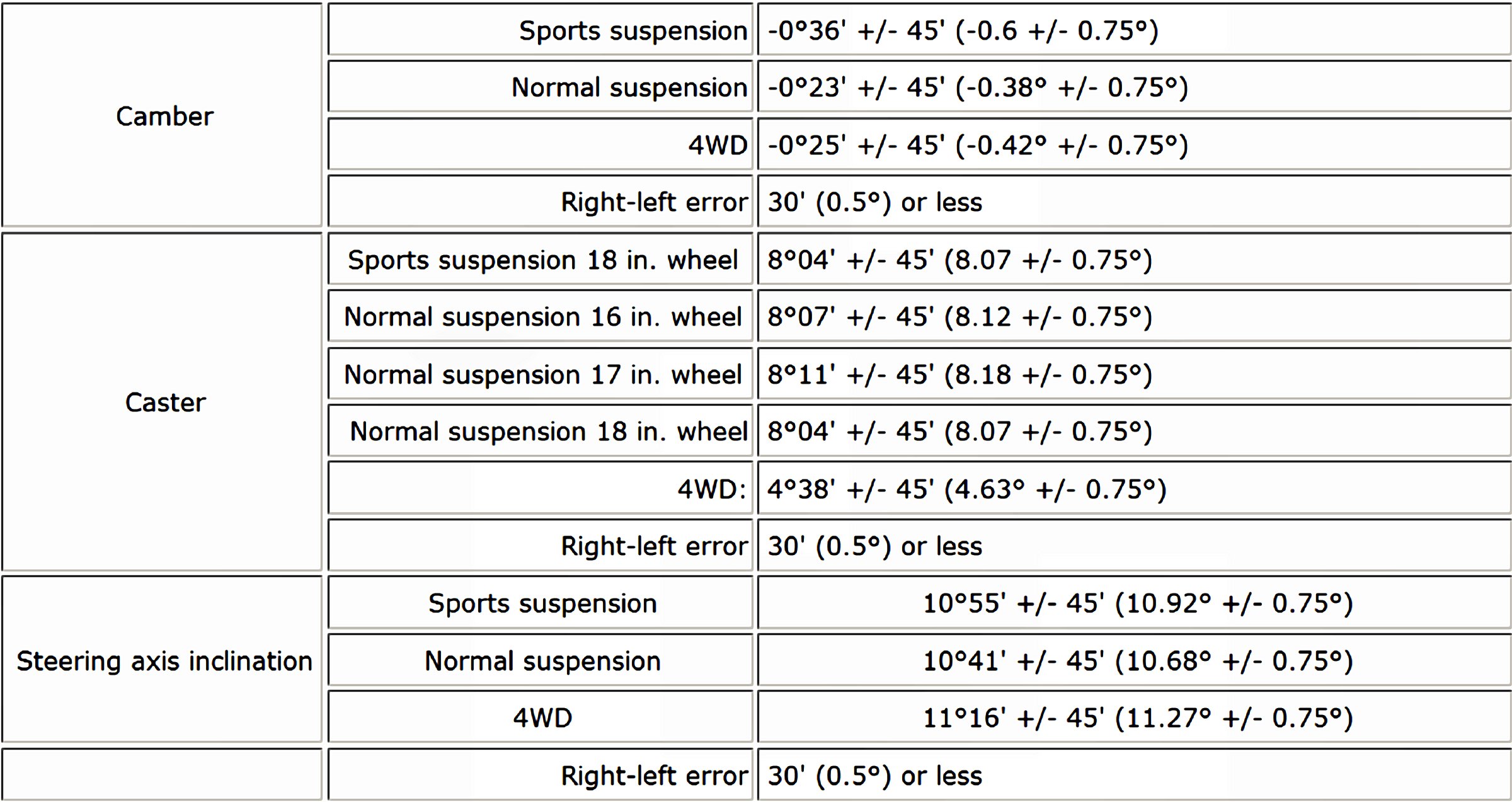 Home >> Lexus >> 2013 >> IS 250 AWD V6-2.5L (4GR-FSE) >> Repair and Diagnosis >> Specifications >> Mechanical Specifications >> Alignment