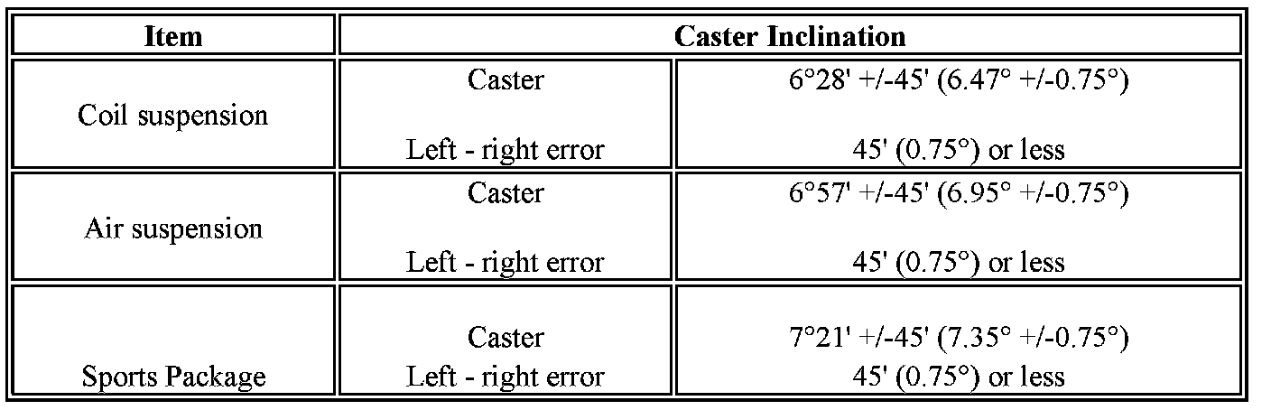 If the caster and steering axis inclinations are not within the specified values, after the camber has been correctly adjusted, recheck the suspension parts for damaged and/or worn out parts.