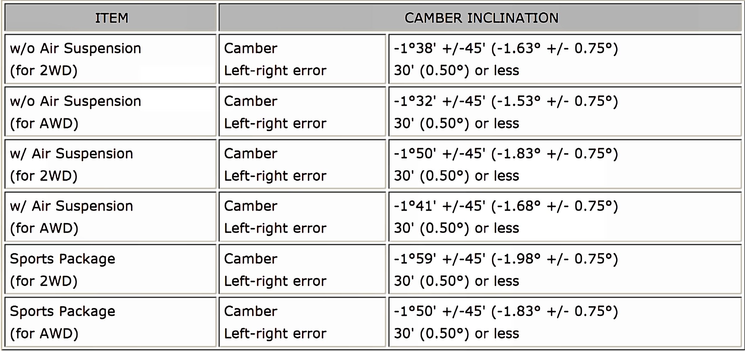 Wheel Alignment Specifications (Unloaded)
