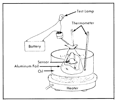 2. Remove sensor and wrap sensor and thermometer in aluminum foil. Place sensor in container of oil. See Fig 1. Connect test light and power source to sensor. Slowly heat oil. Test light should come on when temperature in foil reaches 230-260°F (100-130°C). Replace sensor if defective.