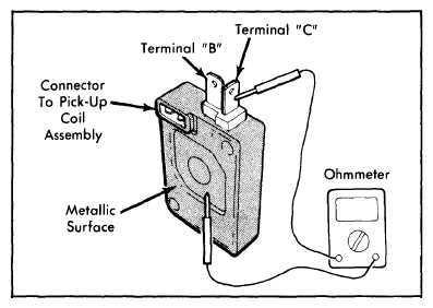 1. Using an ohmmeter, check for continuity between control module (ignitor) terminal "C" and its metallic surface. See Fig 1. If module is installed on distributor, make check between terminal "C" and distributor housing.