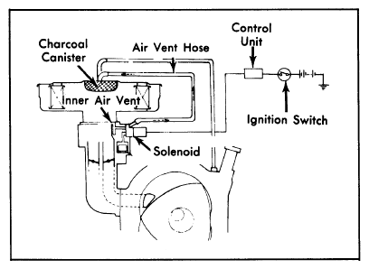 An air vent solenoid is installed on the carburetor on all models, except the RX-3SP. The purpose of this system is to prevent carburetor bowl evaporated fuel from collecting in the intake manifold after a hot engine is shut off. See Fig 1. When the ignition is turned off, the solenoid closes an air vent in the carbon canister, effectively trapping the evaporated fuel.