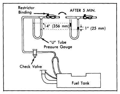 - Disconnect vapor line from ventilation valve system and connect "U" tube pressure gauge to disconnected vapor line. Gradually apply low air pressure into "U" tube so that difference of water level should be 14" (356 mm). See Fig 4.