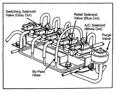 - Reconnect by-pass hose at relief solenoid valve. Using throttle, set engine speed at 2500 RPM. Disconnect vacuum sensing tube from switching solenoid valve (Gray color dot).