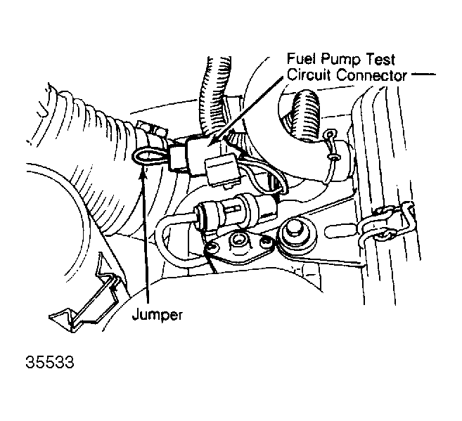 2. Turn ignition on and jumper across 2 terminals of fuel pump test circuit connector. See Figure . Fuel pump pressure should be 50-71 psi (3.5-5.0 kg/cm2 ).
