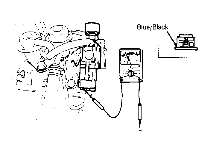 - Connect voltmeter between PRC solenoid Blue/Black wire and ground. With engine running, voltage should be less than 2.5 volts for 4 minutes after starting. After 4 minutes, voltage should be 12 volts. If not repair wiring or connection. See Fig 1