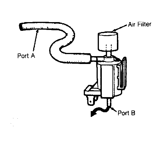 - Disconnect 2 wire connector from solenoid. Connect 12 volts to one terminal and ground the other terminal of solenoid. Blow air though port A. Ensure air exhausts through air filter.